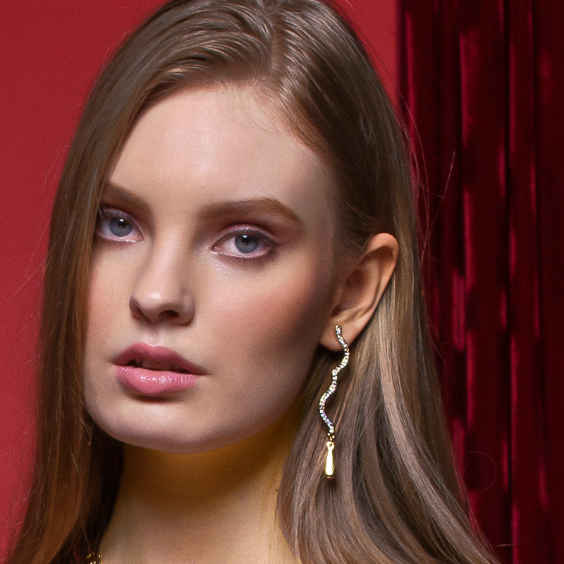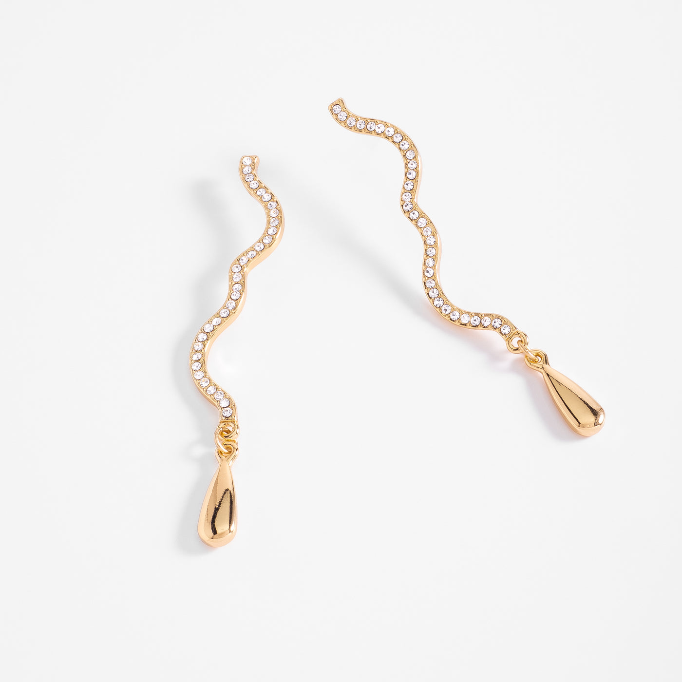 Realza tu estilo con estos elegantes aretes largos tipo poste.Cuentan con un sofisticado Oro y deslumbrantes piedras en tono cristal.Su diseño de forma ondulada y dije de gota pulido te hará brillar.Perfectos para uso diario o eventos especiales.