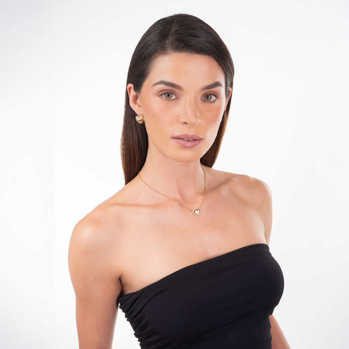 Collar en baño de oro con dos dijes de corazón, uno sólido y otro calado, destacando una piedra central en tono fucsia que aporta un toque brillante y con personalidad. Su diseño contemporáneo y versátil lo convierte en una pieza ideal para resaltar cualquier atuendo, añadiendo delicadeza y luz tanto en ocasiones especiales como en el día a día.